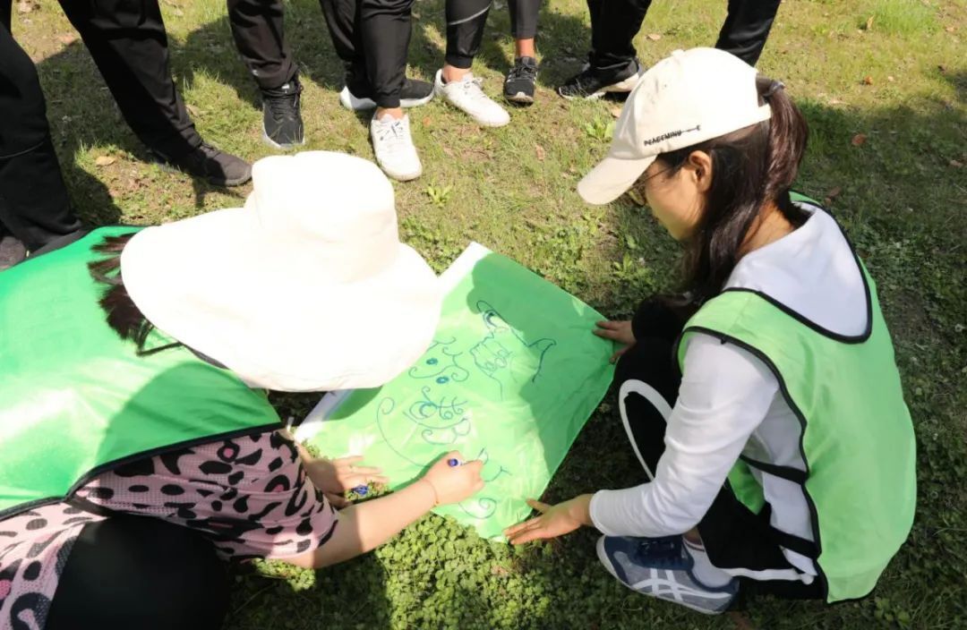 簡單熱身后,教師分成四個小組,每組自行選出組長,發(fā)揮奇思妙想,各自設計了團隊的隊名、口號及團隊造型。“降龍隊”“你都對隊”“向陽隊”“M隊”……大家用極佳的創(chuàng)意、幽默的語言、個性的造型拉開了本次教師團建活動的序幕。