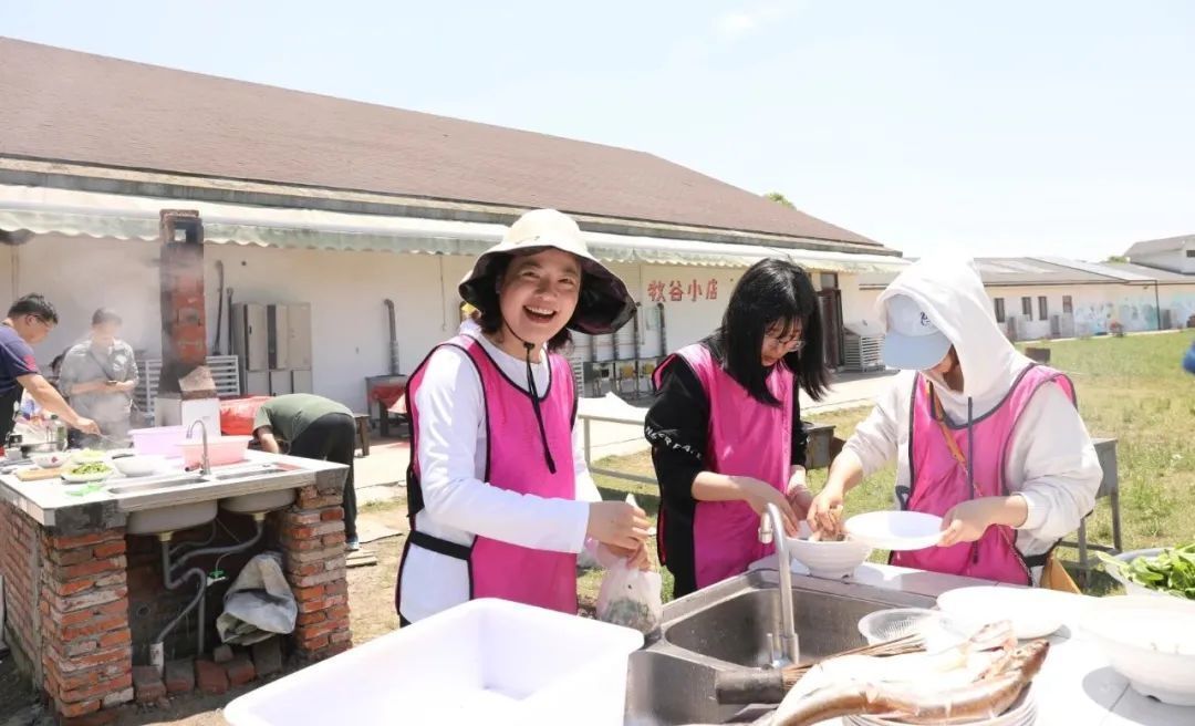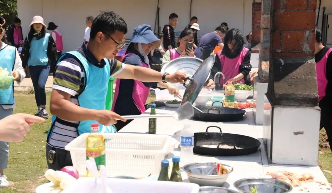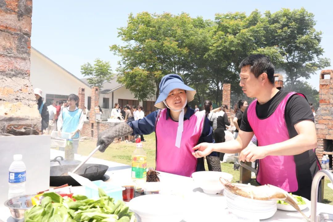 中午時分,大家齊上陣,各自發(fā)揮精湛廚藝,你揀我洗他炒,其忙融融,不亦樂乎。很快一份份色香味形俱全的佳肴精致誕生。所有教師分成四桌享受著大鍋灶埋鍋做飯的別樣美味,邊吃邊聊,聊生活、聊工作和學習的話題,進一步拉進了彼此之間的距離,增進了彼此之間感情。