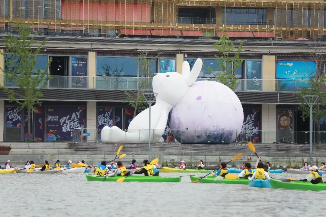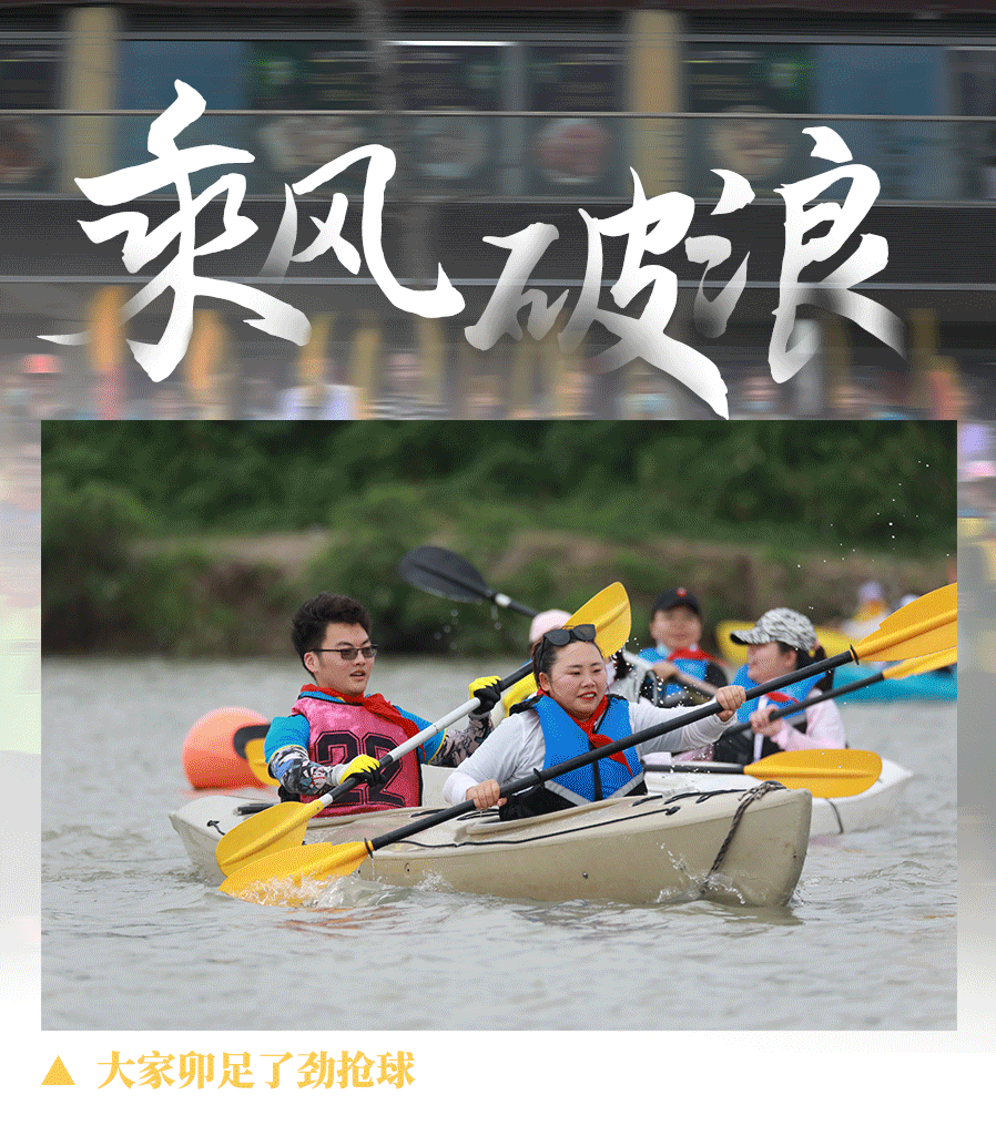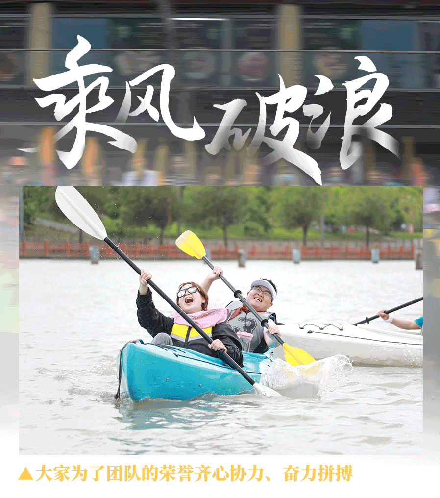 團(tuán)建教練一聲令下,兩兩組隊(duì)的搭檔們努力適應(yīng)雙槳的角度,調(diào)整方向、相互配合,奔向彩色的海洋球,一瞬間,百舸爭(zhēng)流的場(chǎng)景異常壯觀(guān)。
