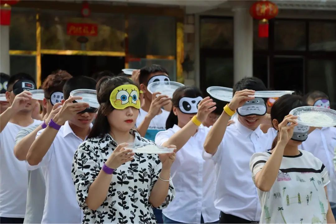 除了力量與才智,工作中更不可缺的是團隊協作能力,接下來的這個游戲尤其考驗隊員的默契。每組隊員戴上眼罩向背后隊員傳遞面粉,藍隊通過完美的配合,以傳遞面粉量最多者獲得第一,積3分。