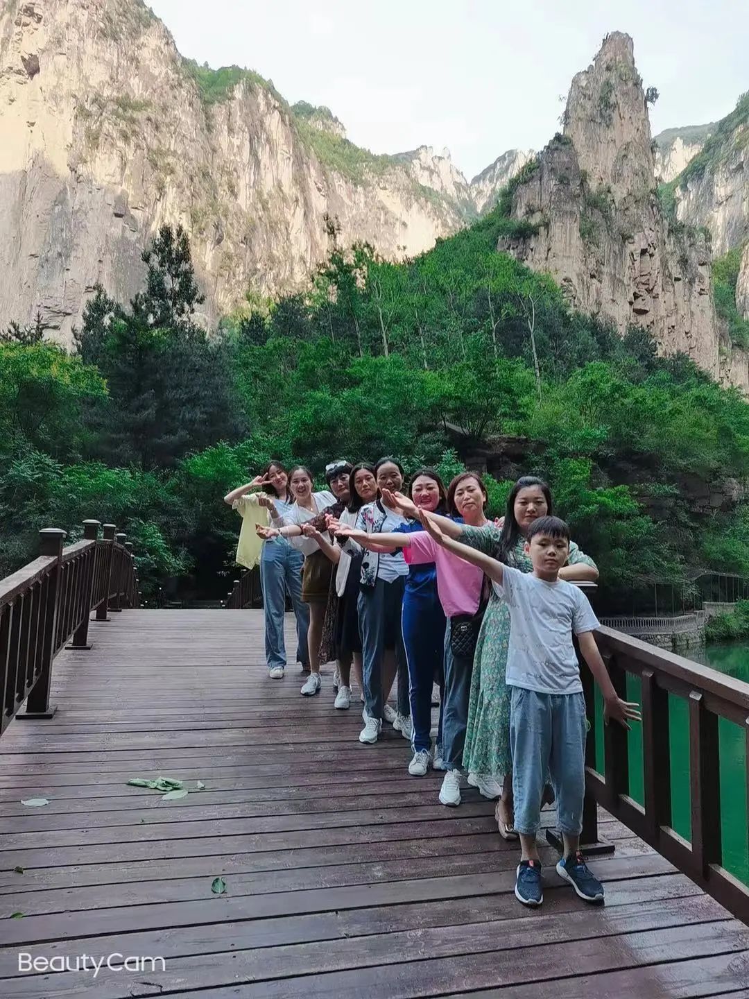 下車后大家紛紛合影如這烈陽一般熱情,通天大峽谷堪稱北方小九寨,在刀削斧劈的懸崖谷底,千姿百態的山石,如練似銀的瀑布,碧波蕩漾的深潭,四季分明的景色,無不讓人流連忘返。