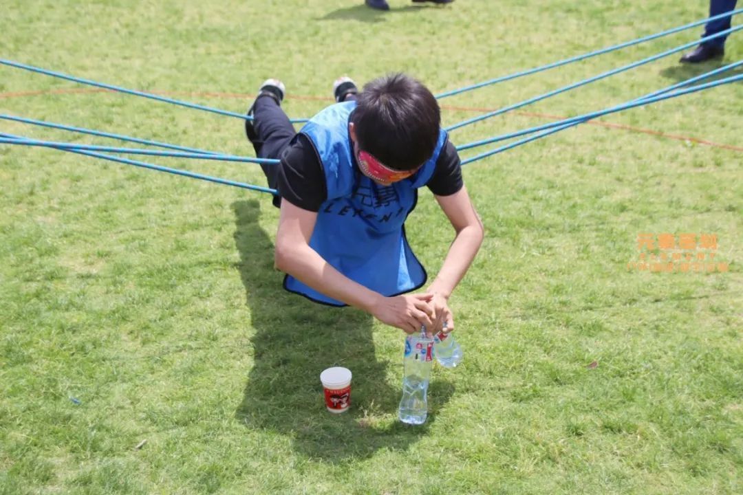 團隊用兩根繩將取水成員送入圈內,隊員在不接觸地面的情況下取出荊棘中的水瓶,這個任務培養(yǎng)團隊成員各盡所能,共同努力完成任務的能力。