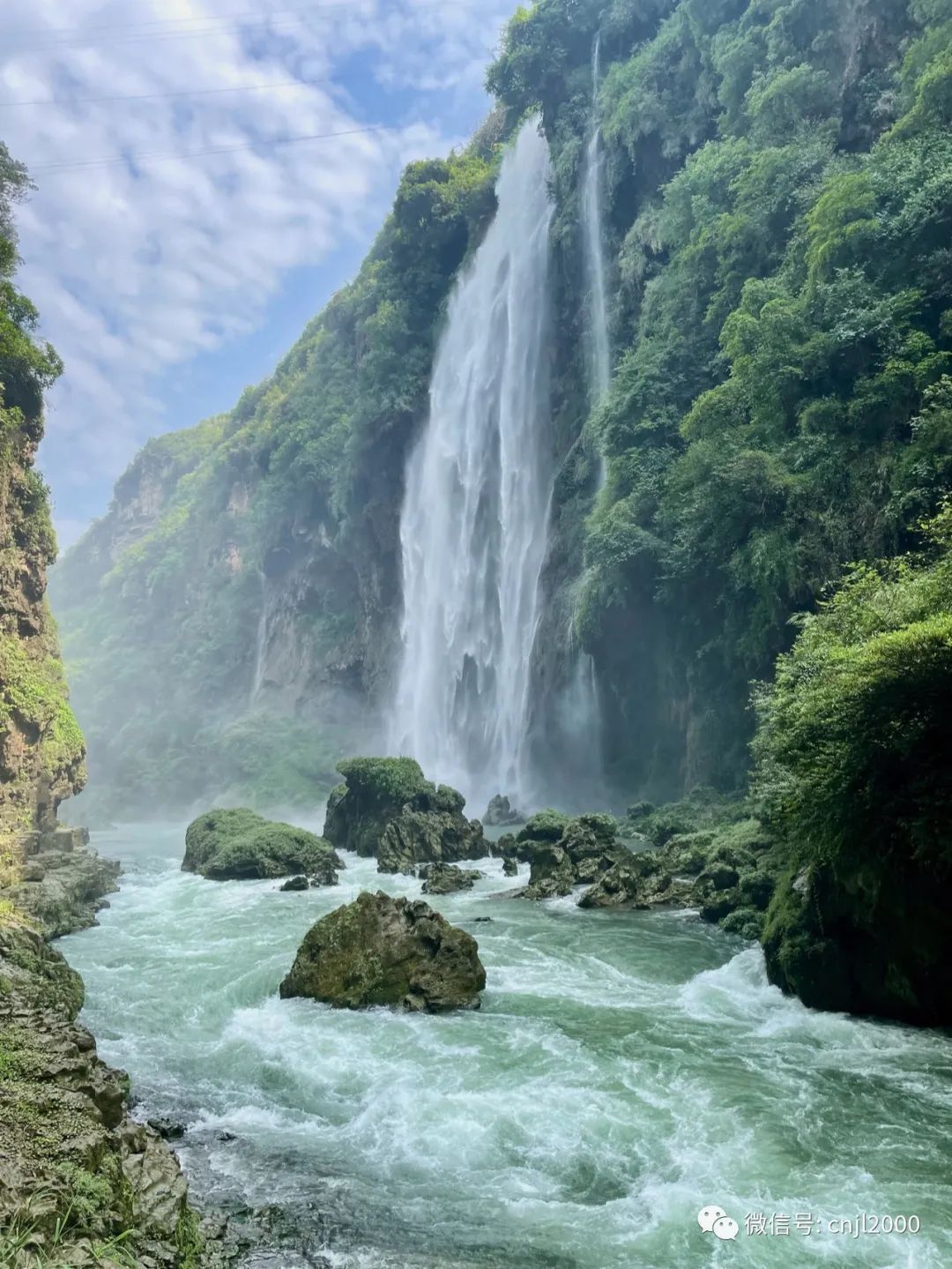 在馬嶺河,我們看到,綠葉與巖面搭配,水珠映照天光,仿佛是一壁色彩斑斕的巨幅油畫。在布滿巖頁(yè)壁掛的這一帶峽谷中,飛瀉著大大小小10多條瀑布,組成眾多水流爭(zhēng)奇斗美的瀑布群,有的像銀紗輕抖,有的像白練懸掛,有的像萬(wàn)馬奔騰,有的像珍珠飛灑。