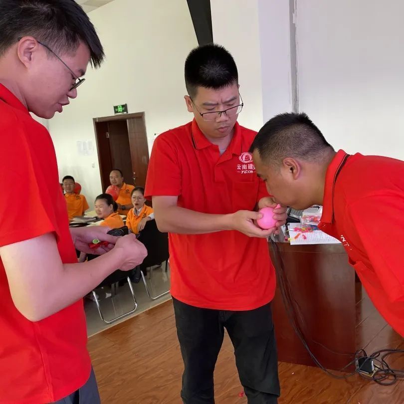 “合力吹氣球”團建游戲是團隊協作能力的充分展現,三人成組,一人吹一人拿,第三人負責踩,分工明確。團隊成員動作要快、氣球吹得越多,踩得也越多。