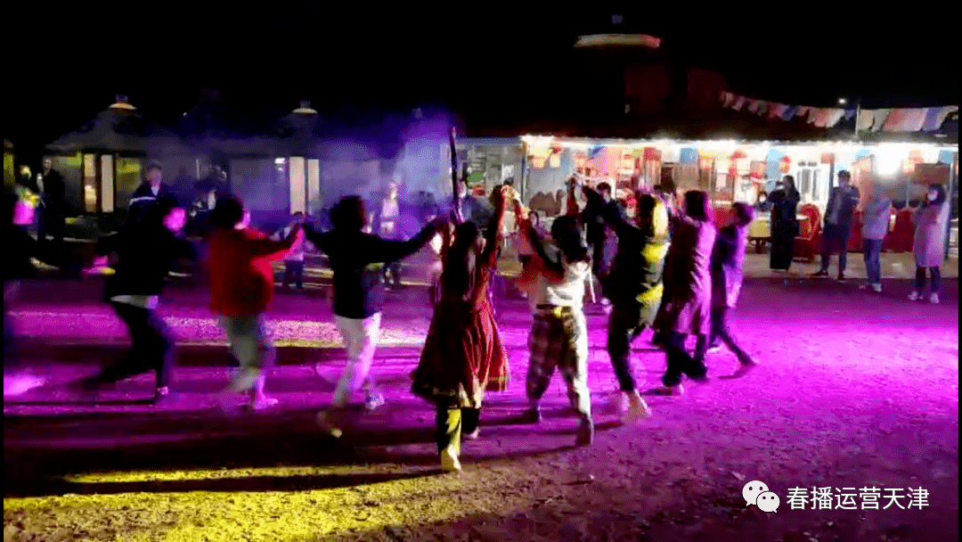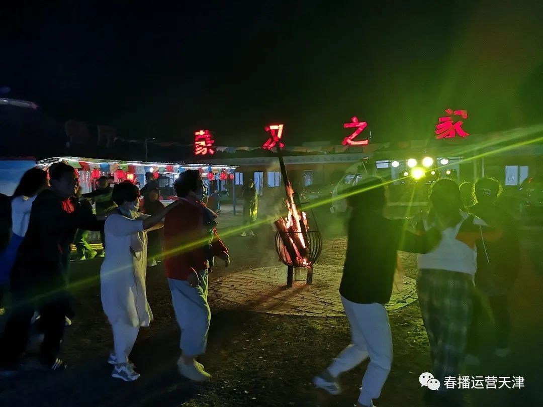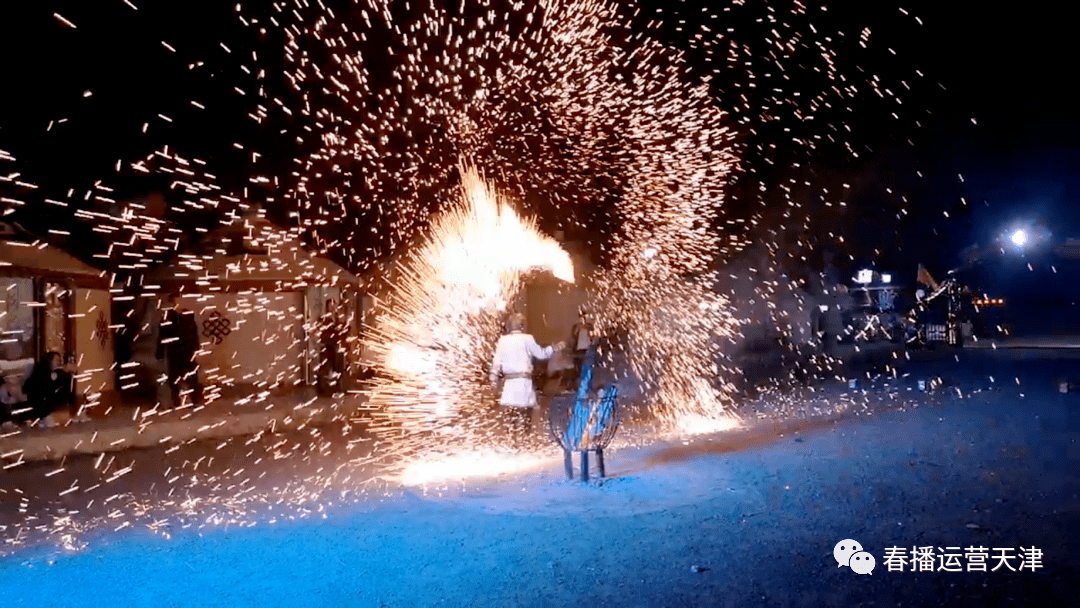 宴席過后,篝火晚會正式開始,大家載歌載舞,圍著熊熊燃燒的篝火盡情歡暢,當地的牧民也為客人帶來了馬頭琴獨奏和打樹花的表演,讓客人們欣賞到了草原的文化。