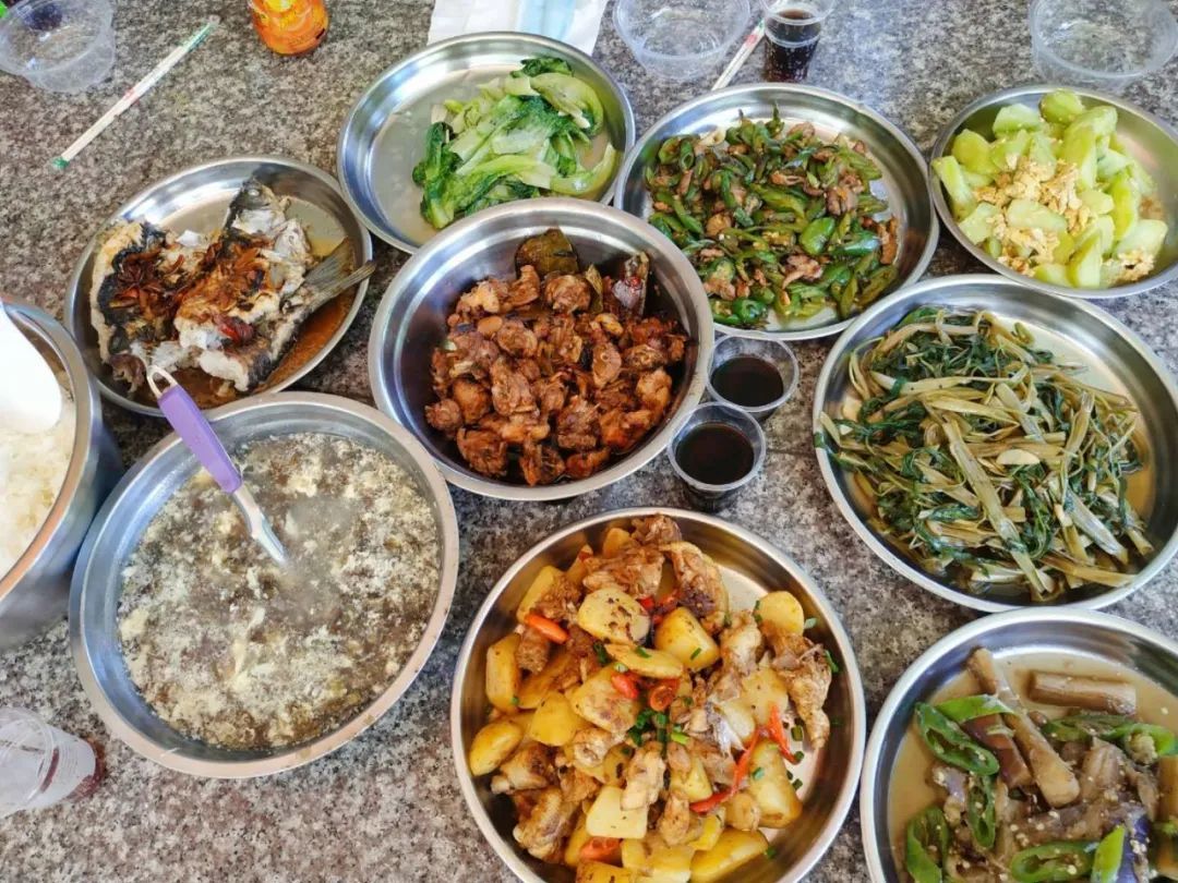 只見一組的小伙伴不會(huì)處理生魚,只能求助三組的外援小姐姐,最終成功做出了一道色香味俱全的紅燒魚。三組的小伙伴們則選擇放棄餃子,最快吃上了午飯。而二組的小伙伴們則利用簡陋的條件,做出了口感嫩滑的白切雞,醬料香辣,真是棒棒噠!土豆?fàn)F雞、啤酒鴨、虎皮尖椒、紫菜蛋花湯、辣椒炒肉、紅燒茄子、紅燒魚……午餐真是太豐盛了。