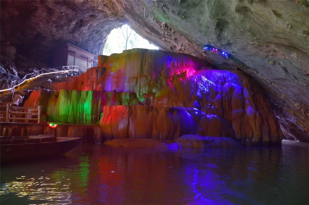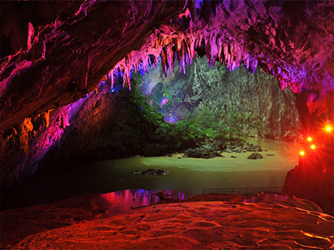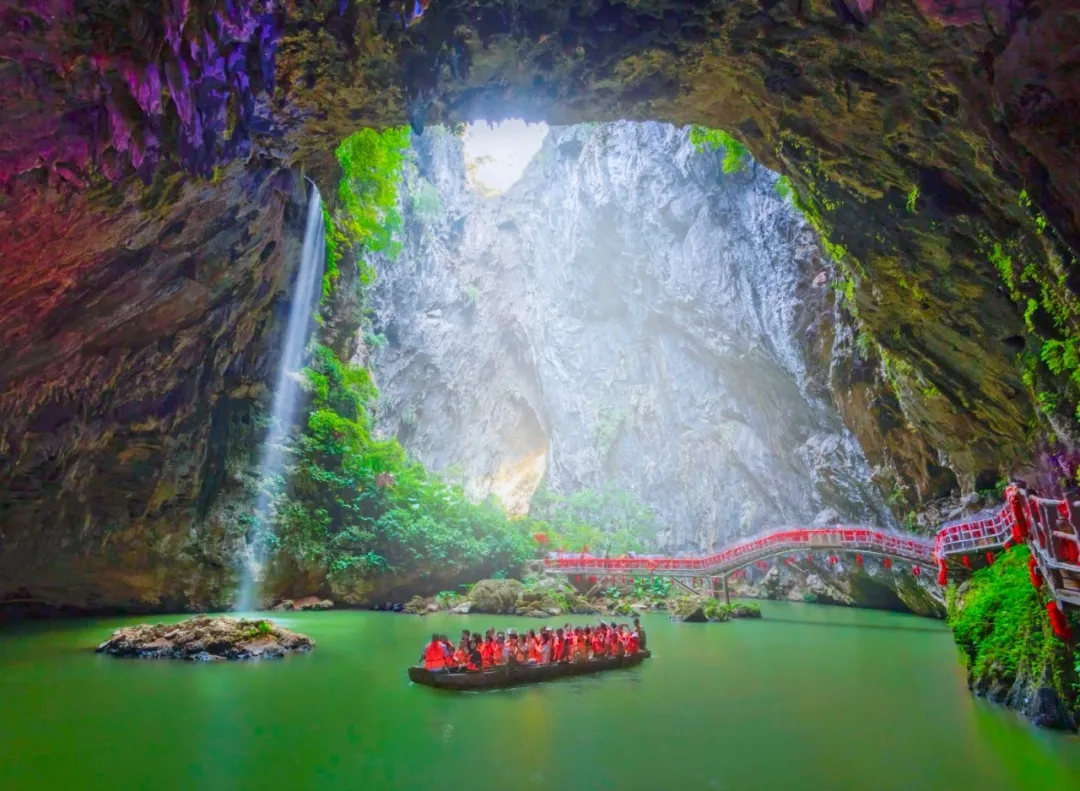 泛舟天坑,兩岸鐘乳林立,石筍如畫,晶瑩斑斕, 七彩水影天幕,天然白玉觀音像,穿越“亞洲首創-溶洞懸空玻璃棧道”,徒步“穿天懸空棧道”更能突顯出大自然的鬼斧神工與人類智慧的相結合。