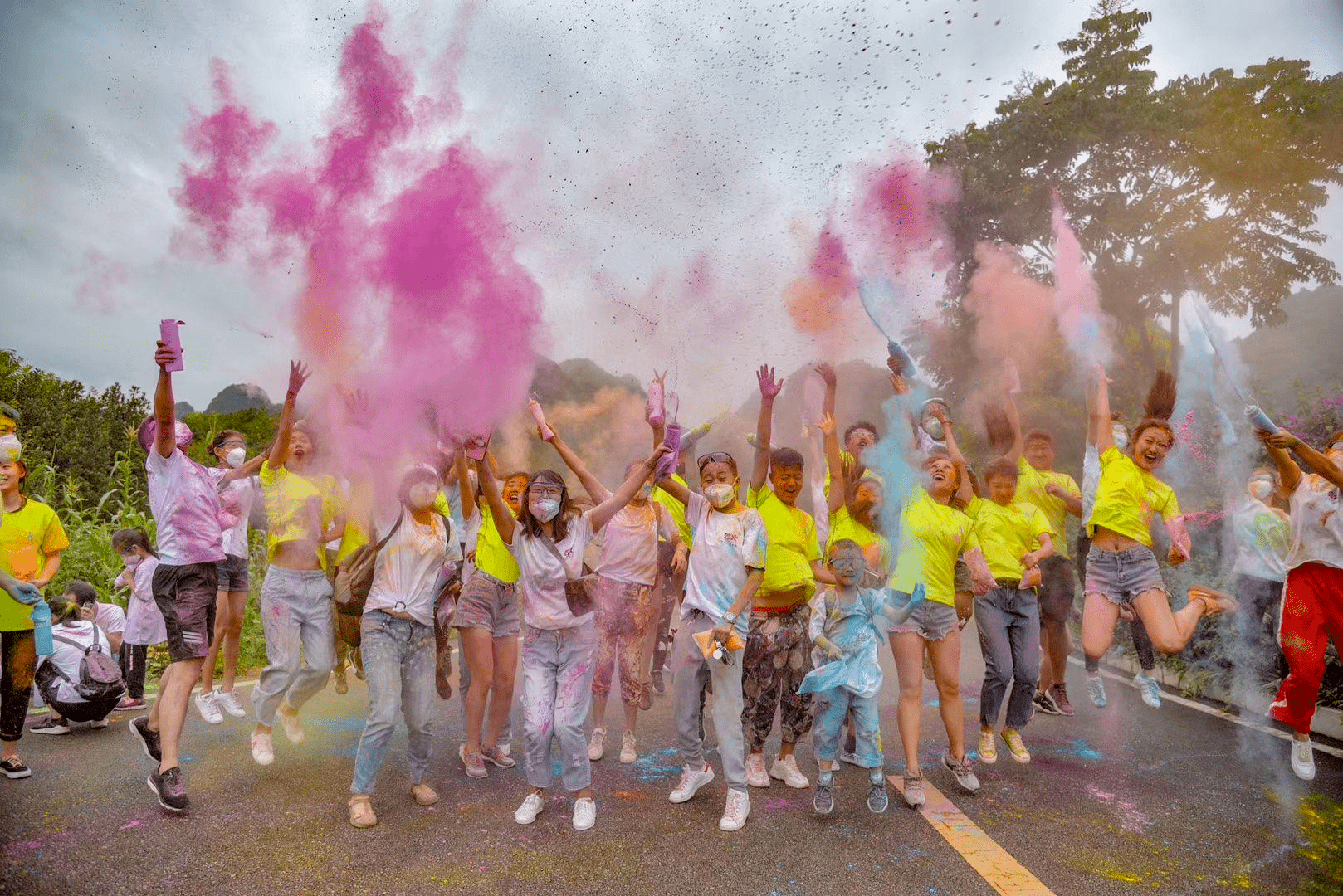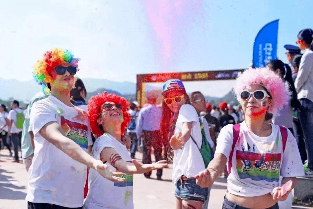 彩色跑團建活動除了繼承了彩虹跑傳播快樂的精髓,,還為其注入了當?shù)乇就恋奶厣瑹òl(fā)著新鮮事物的力量。全程共分為五個彩色站,依次為起點-紅-黃-藍-紫-綠-終點,每一個顏色的彩色站的跑道外的工作人員會都向參與者撒播彩粉,以示祝福。