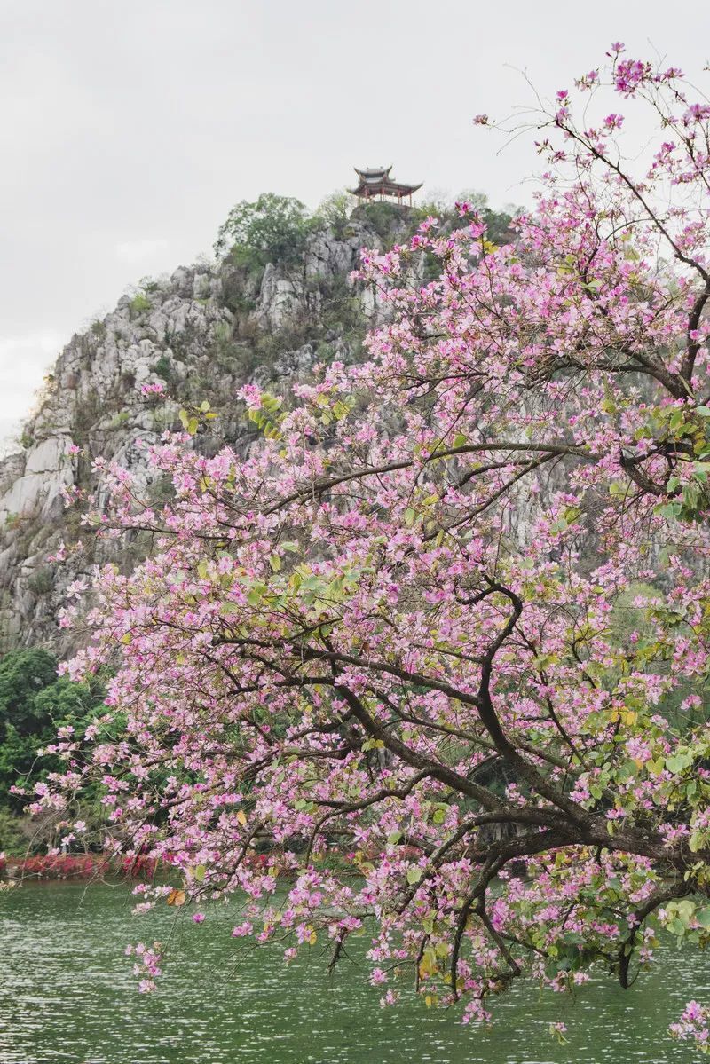 每年春季,來七星巖,從東門而入,來到堤邊,到處都是粉粉的,淡淡的,如煙如云的宮粉紫荊。一陣春風徐徐吹來,花兒漫天飛舞,如同電影場景,算是和春天來了一個結結實實的擁抱。