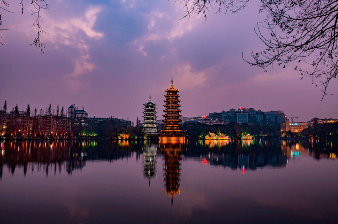 兩江四湖適合夜游,在這里可以體驗到“城在景中,景在城中”的和諧景觀。兩江四湖的精華是日月雙塔。
