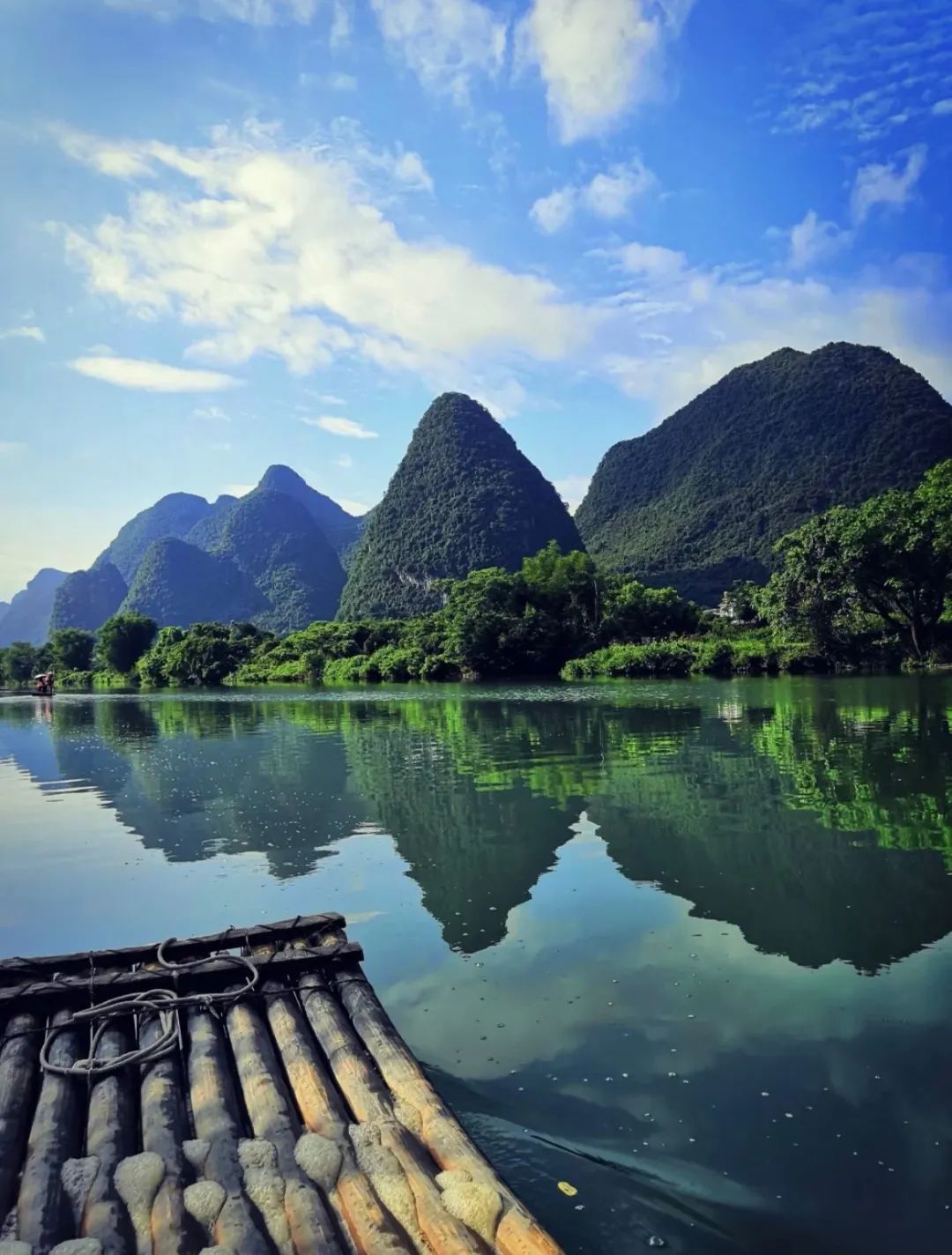 悠悠遇龍河,感受詩意山水,遇龍河是漓江在陽朔境內最長的一條支流,坐著竹筏慢悠悠欣賞兩岸的山水,體驗一種”人在畫中游“的感受。