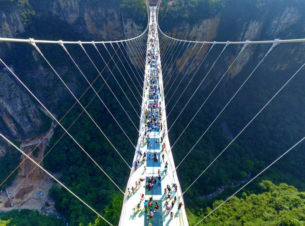 張家界大峽谷玻璃橋位于湖南省的張家界大峽谷景區(qū)內(nèi),號稱世界最長、最高的全透明玻璃橋,玻璃橋總長430米、寬6米,橋面距谷底約300米,可站800人。橋面全部采用透明玻璃鋪設(shè),橋中心有全球最高的蹦極臺,整個(gè)工程無鋼筋支架,是一種全玻璃結(jié)構(gòu)的橋梁。