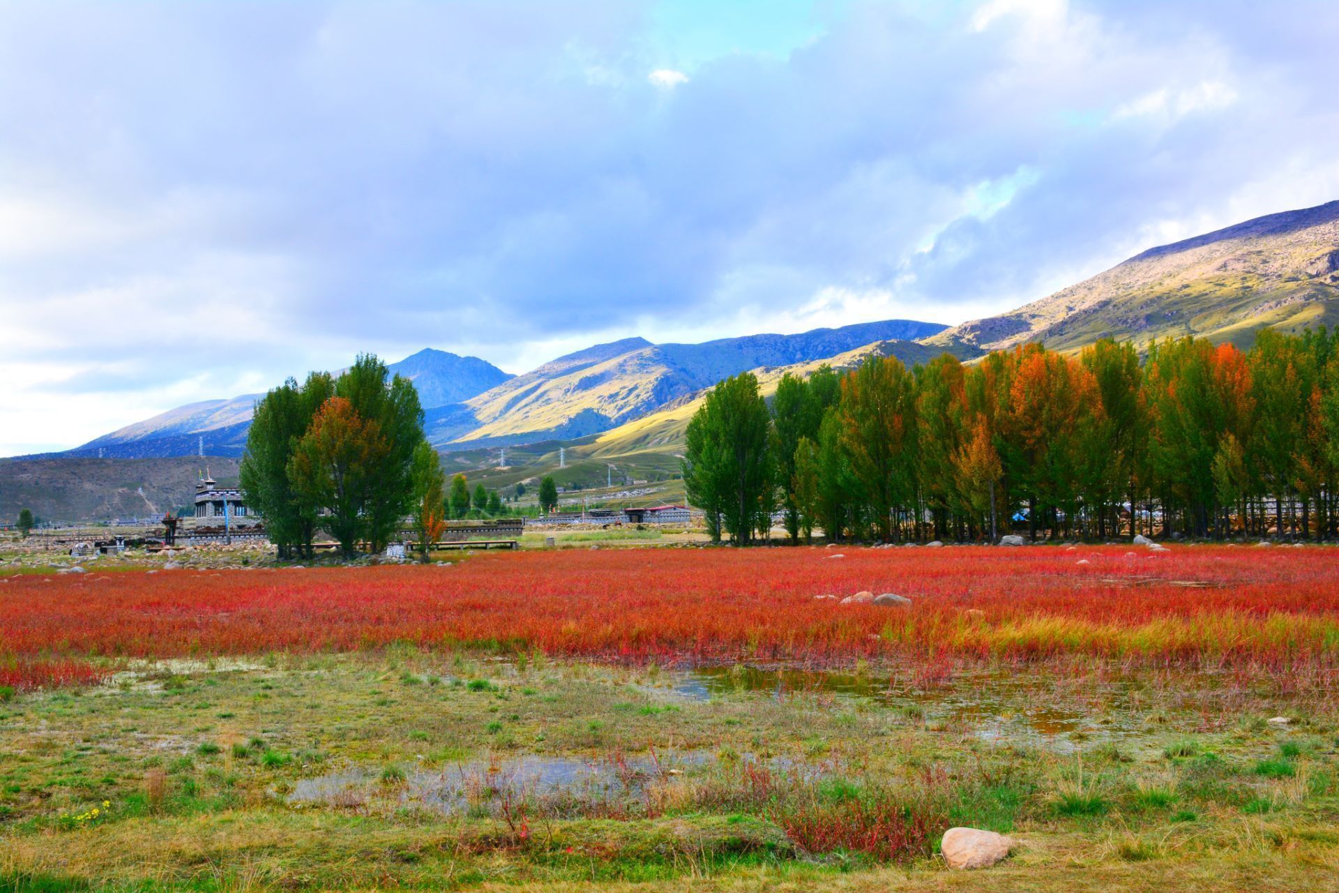 紅草地位于桑堆小鎮(zhèn)距稻城縣城西北28km,牧場(chǎng)在公路沿線平展鋪開,河水靜靜地從中穿流而過(guò)。遙望遠(yuǎn)處,在起伏的山巒間散落著村落、牧人、牛羊,呈現(xiàn)一派寧?kù)o祥和的景象。(紅草灘的季節(jié)性很強(qiáng),每年僅在秋季出現(xiàn),而且時(shí)間很短,只有十幾天時(shí)間(10月初到中旬)可以看到)